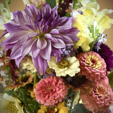 The third 4 week session of the 2025 CSA include large bouquets with seasonal flowers and premium lisianthus and dahlias. Other flower varieties include zinnias, ornamental grasses, Queen Anne's Lace, Euphorbia and more.